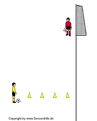 Material: Ausreichend Bälle pro Gruppe, 1 Tor, Hütchen oder Bodenmarkierungen zur Orientierung.