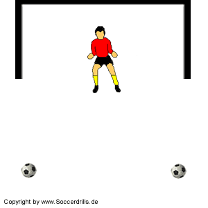Zwei Bälle liegen, je nach Leistungsstand, einige Meter rechts und links vor dem Tor. Auf Kommando des Trainers kommt der Torwart aus dem Tor und simuliert auf jeder Seite eine Ballsicherung im Liegen. Danach übernimmt er sofort wieder, mit Blick nach vorne, die Torsicherung. Es erfolgt ein Schuss aufs Tor durch den Trainer und der Torwart versucht, den Ball zu halten. Intensität und Schärfe der Torschüsse langsam erhöhen. Achtung: Die Übung ist sehr anstrengend!
