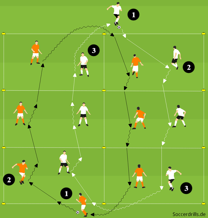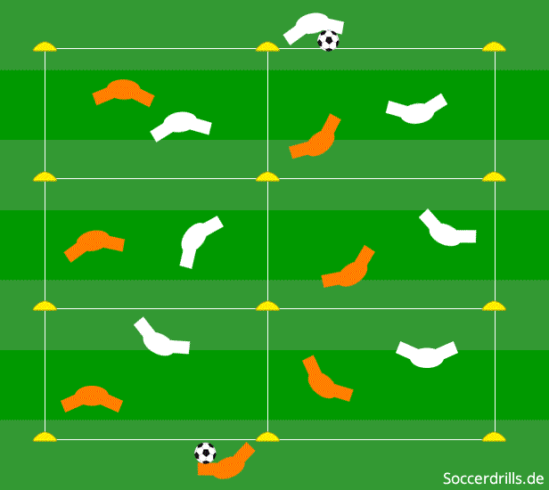 Diese Trainingsübung eignet sich zum Aufwärmen und zum Ausdauertraining in der Saisonvorbereitung. Fürs Ausdauertraining wird der Ablauf wesentlich intensiver ausgeführt. Beachte, dass die Ausführung schwerer wird, wenn die Felder größer sind. Die Anforderungen ans Passspiel und der Ballkontrolle sind dann wesentlich größer.