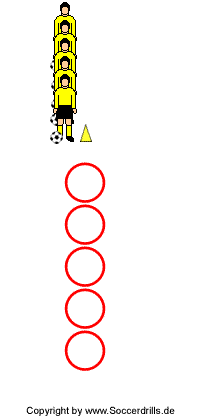 Markiere verschiedene Zielfelder. Es eignen sich viele Materialien zur Markierung, sehr gut machen sich Reifen. Die Zahl der Spieler entspricht der Anzahl der Reifen. Im ersten Durchlauf wird der Ball in die einzelnen Zielfelder transportiert, um den Ball dann im zweiten Durchgang wieder abzuholen. Achte darauf, dass der Ball im Zielfeld ruhen muss.