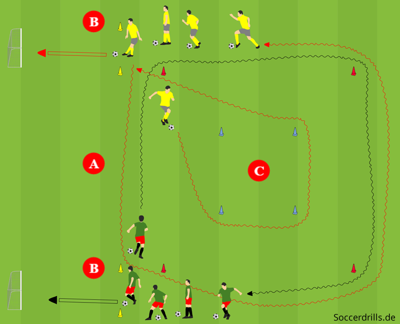 - Ist das Übungsfeld umrundet worden, passen die Spieler ihren Ball ins Minitor.