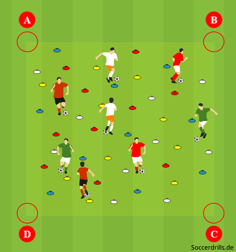 Material: Für jeden Spieler einen Ball, viele verschiedenfarbige Bodenmarkierungen, Reifen oder Hütchen für die Ecken.