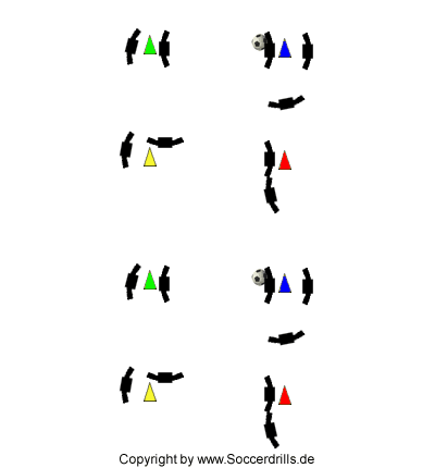 Die Spieler passen den Ball gegen den Uhrzeigersinn ums Quadrat. Sie folgen jeweils ihrem Pass und schließen sich der nächsten Gruppe an.