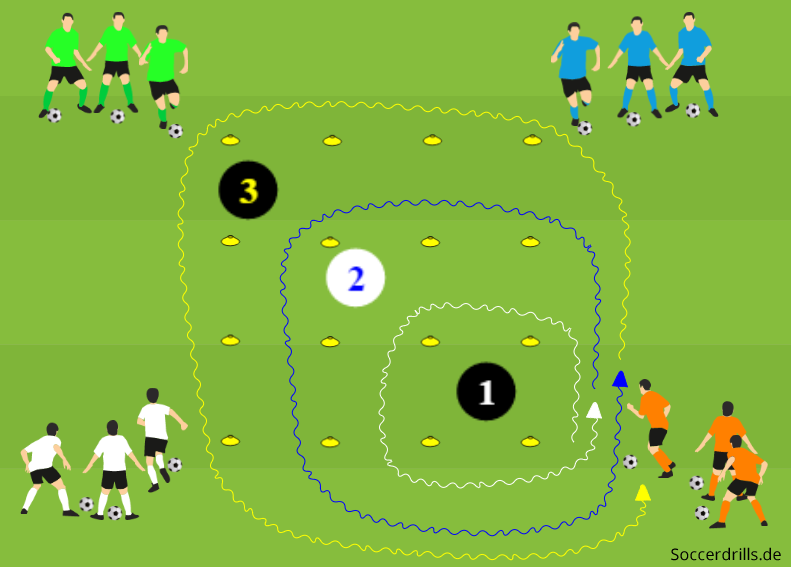 - Die Spieler dribbeln in der Reihenfolge: Kreis 1, 2 und 3.