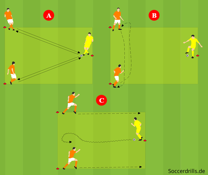 Alle Spieler orientieren sich am Kapitän der Gruppe, er gibt den Ablauf vor. Dabei kann er ein schnelles Passspiel aufziehen, den Ball kontrollieren und Laufbereitschaft fordern oder den Ablauf komplett auf die andere Seite verlagern. Mit diesem Dreieckspiel erwarten wir einiges von unseren Spielern, was spielerisch aussieht und einfach abläuft, steckt voller taktischer, technischer und konditioneller Inhalte.