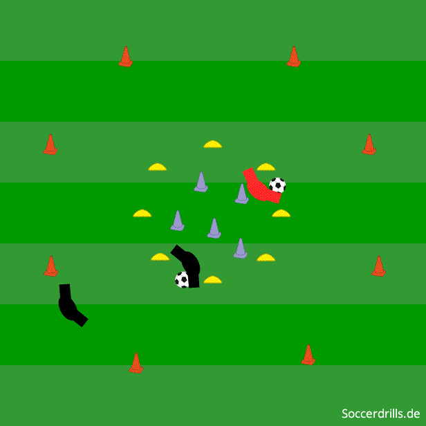 Material: 8 Hütchen für den Außenkreis, 8 Bodenmarkierungen und eine unbestimmte Anzahl an Hütchen (Slalomstangen) für den Innenkreis. In den Varianten wird für jeden Spieler ein Ball benötigt, ansonsten einen Ball für jedes Paar.