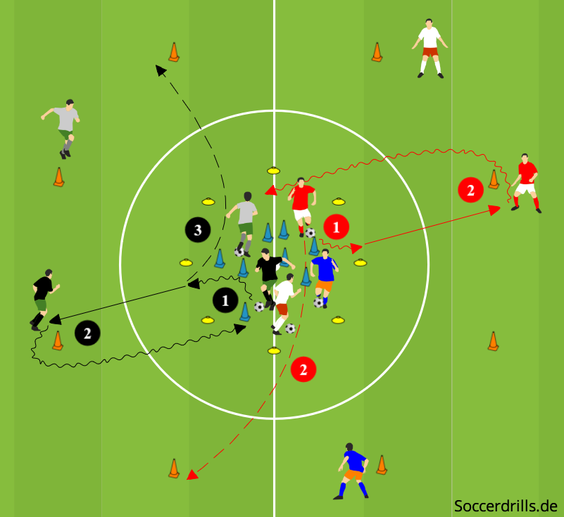 - Jeder Spieler hat einen Ball und es wird ständig von außen nach innen gedribbelt. Der Spieler im Innenkreis sucht seinen Mitspieler am Außenkreis und dribbelt entsprechend in die gegenüberliegende Position. Dann passen beide gleichzeitig, was deutlich schwerer ist.