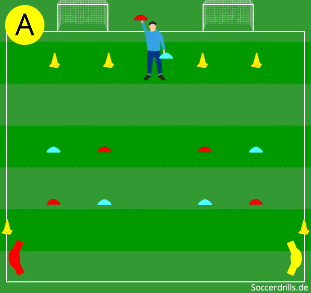 - Es werden 6 Hütchen, 2 x 5 verschiedenfarbige Bodenmarkierung und für eine Variante zwei Minitore (Hütchentore, Stangentore) benötigt. Zusätzlich sollten für die Varianten ausreichend Bälle verfügbar sein.