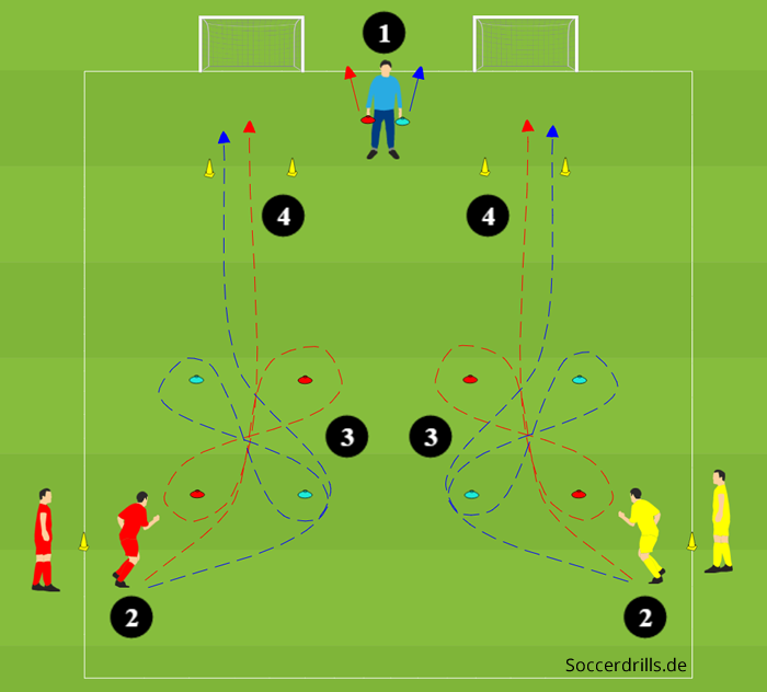 - Beide Spieler laufen um die die roten oder blauen Markierungen in ihrem Quadrat (Achterlauf) herum. Welche Farbe sie umrunden, entscheidet sich danach, welche Markierung der Trainer hochhält (siehe rote und blaue Linie in der Grafik).