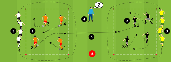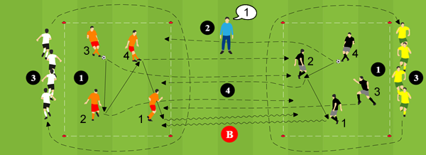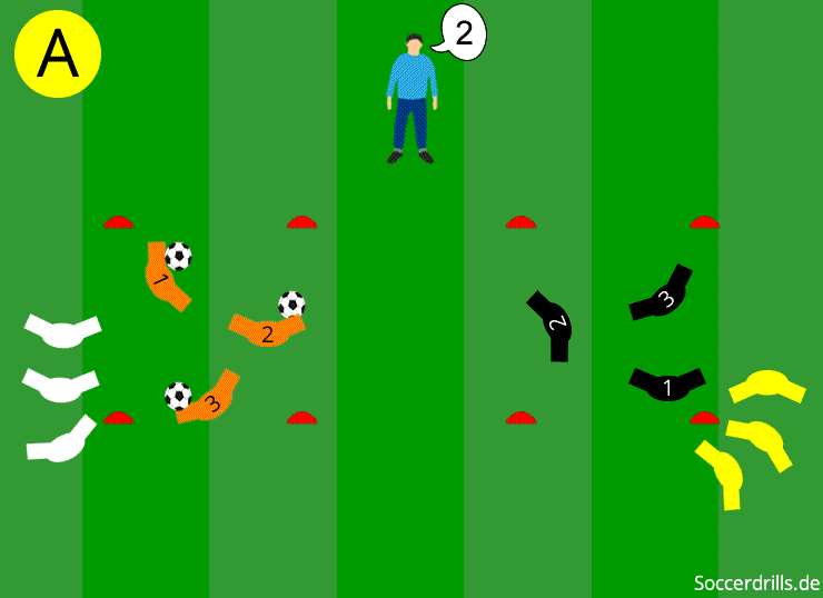 - Der aufgerufene Spieler mit Ball dribbelt zum Boxrand und passt zum Spieler mit der gleichen Nummer auf die andere Seite.