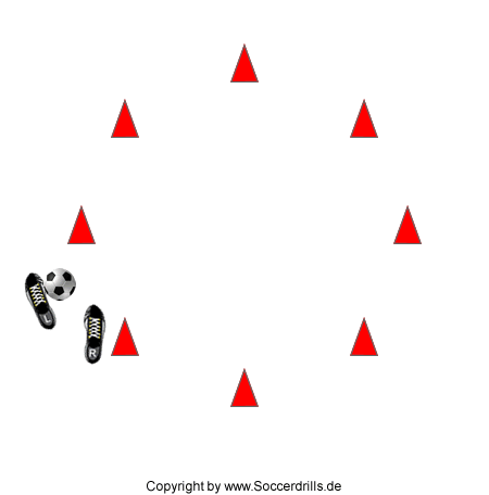 Im Slalomdribbling um den Kreis herum. Der Ball wird immer mit dem, vom Hütchen enferntesten Fuß, geführt. Die Schulter, die zum Hütchen zeigt, wird jeweils leicht nach vorne geschoben.