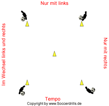 Material: Jeder Spieler hat einen Ball, 5 Hütchen oder Bodenmarkierungen.