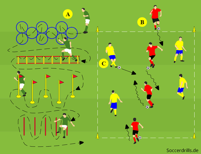 - Drei Gruppen werden eingeteilt (Grün, Rot und Gelb). Gruppe B erhält einen Ball zum Passspiel, in Gruppe Rot verfügt jeder Spieler über einen Ball und Gruppe Grün agiert ohne Ball.