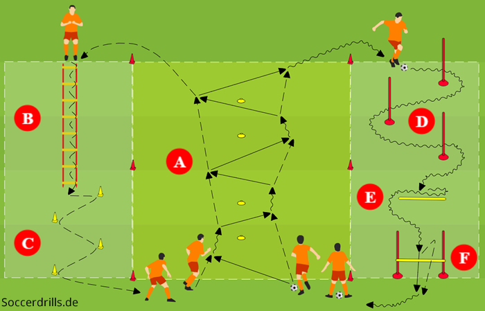Material: 10 Hütchen, 4 Bodenmarkierungen, eine Koordinationsleiter, 3 Slalomstangen, eine Hürdenstange, eine Hürde und ausreichend Bälle.