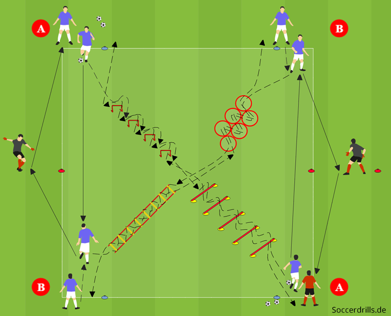 Bereits beim leichten Aufwärmen arbeiten wir mit einem kleinen, aber effektiven Koordinations- und Technikparcours. Der Parcours wurde so konzipiert, dass Torhüter integriert werden können. Es geht natürlich auch ohne Torhüter, dann werden diese durch Spieler ersetzt.