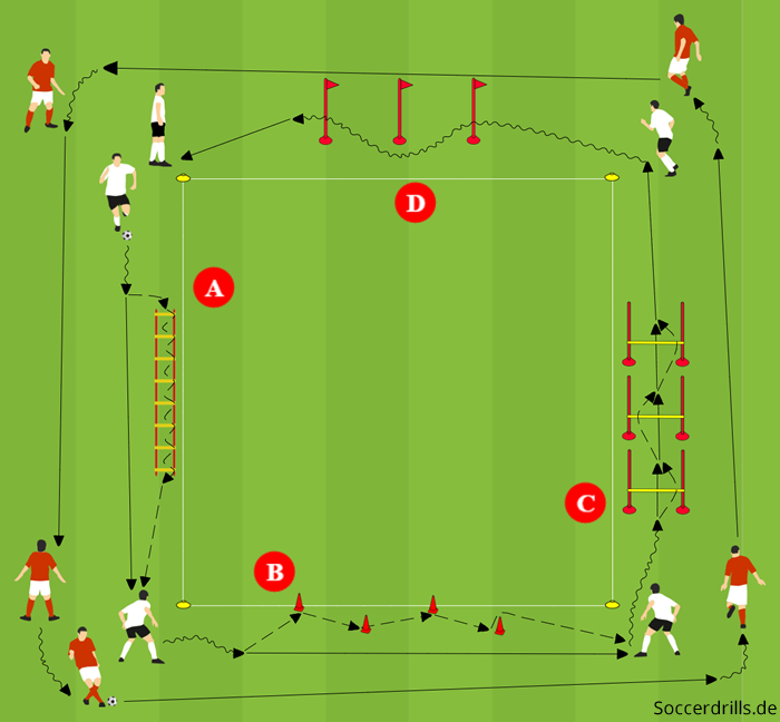 - Der Spieler kontrolliert den Ball und dribbelt zu den Hürden. Er passt unter jeder Hürde hindurch und überspringt diese. Nach übersprungener letzter Hürde passt er zum Mitspieler an der nächsten Ecke.