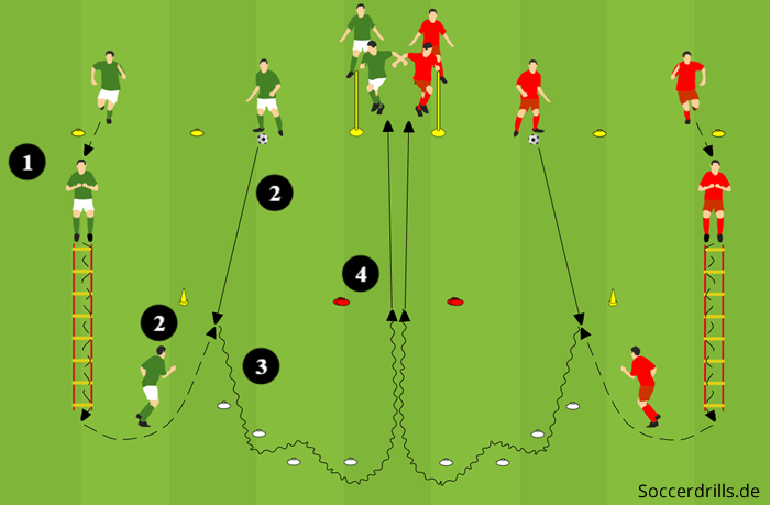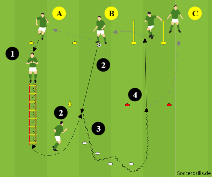 - Nachdem A die Koordinationsleiter absolviert hat, startet er diagonal zum Hütchen und erhält dort das Zuspiel von B.