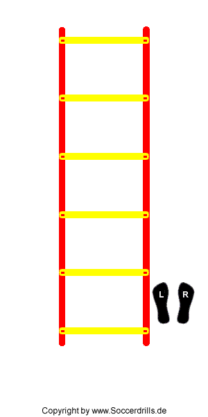 Wir laufen seitlich an der Leiter vorbei und treten immer, mit dem Fuß der sich an der Agility Leiter befindet, in die Fächer. Auch hier gilt, je höher das Tempo, desto schwieriger die Schrittfolge. Kurze, schnelle Schritte sorgen für die höchste Geschwindigkeit.