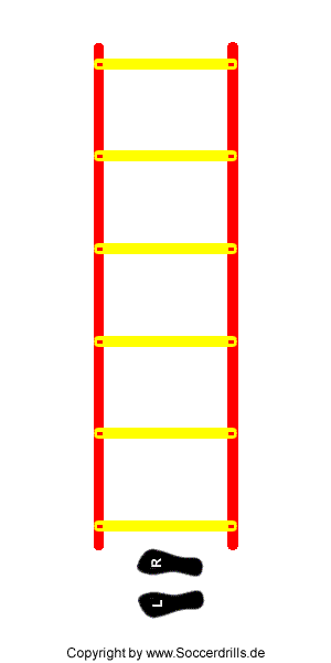Im Sidestep durch die Koordinationsleiter. Blickrichtung nach links und dann gehts los. Der rechte Fuß wird seitlich in den vorderen Teil des Fachs gesetzt, der linke Fuß direkt darunter. Ab jetzt wird gesteppt und zwar seitlich.