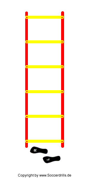 Wir stehen seitlich zur Leiter. Die Blickrichtung geht nach links und der rechte steht etwas vor dem linken Fuß. Der rechte Fuß wird ins erste Fach gesetzt und zwar dicht vor die ersten Sprosse. Jetzt wird der linke Fuß vor dem rechten abgesetzt. Dann folgt wieder der rechte Fuß und so geht die Schrittfolge immer weiter.