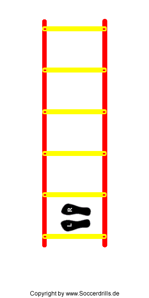 Wir starten mit beiden Beinen im ersten Fach. Der erste Step erfolgt mit dem rechten Fuß. Wir treten nach vorn in Richtung erste Sprosse, jedoch außerhalb der Leiter. Der linke Fuß geht hiter das rechte Bein ins zweite Fach. Jetzt wird der rechte Fuß vor dem linken ins zweite Fach gesetzt. Mit dem nächsten Schritt wird der linke Fuß hinter das rechte Bein geführt. Er wird außerhalb der Leiter auf Sprossenhöhe abgesetzt. Der rechte Fuß stept danach in den oberen Teil des dritten Faches. Den linken Fuß setzen wir unter dem rechten Fuß ab. Dann beginnt der Ablauf von vorne. Schwierig? Ja!