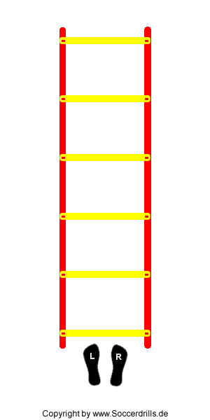 Der erste Step erfolgt mit dem rechten Fuß neben das erste Fach der Leiter. Das linke Bein wird ans rechte herangezogen, ohne den Fuß abzusetzen. Der Spieler drückt sich mit dem rechten Fuß ab, um mit dem linken im ersten Fach zu landen. Jetzt wird das rechte ans linke Bein gezogen, ohne den rechten Fuß abzusetzen. Mit dem linken Fuß abdrücken um auf dem rechten zu landen, das Fach wird dabei nicht verlassen. Linkes Bein ans rechte ziehen, ohne den Fuß abzusetzen. Jetzt drückt sich der Spieler mit dem rechten Fuß ab und wiederholt den Ablauf im nächsten Fach. Erst danach wird mit einem Step die Leiter wieder verlassen.