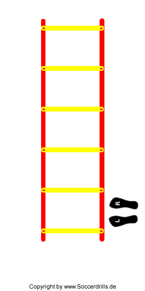 Das "Easy" ist weg und schon wirds schwerer. Wir starten rechts von der Leiter am ersten Fach. Der linke Fuß stept in den oberen Teil des ersten Faches. Danach wird der rechte Fuß seitlich, außerhalb der Leiter, knapp über die zweite Sprosse gesetzt. Den linken Fuß setzen wir anschließend unter den rechten, auch außerhalb der Leiter. Jetzt stept der rechte Fuß in das nächste Fach und der linke Fuß wird knapp unter die nächste Sprosse (außerhalb) gesetzt. Der rechte Fuß folgt dem linken. Jetzt beginnt der Ablauf von vorne.