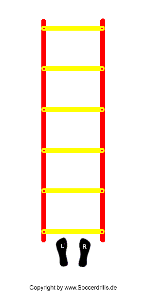 Wir springen in die Leiter, wobei sich bei der Landung zwischen dem rechten und dem linken Fuß immer die Leiter befindet. Der erste Sprung geht nach links, dann erfolgt eine Vierteldrehung zur zweiten Sprosse. Von dort springen wir zum rechten Leiterrand und so geht es immer weiter.