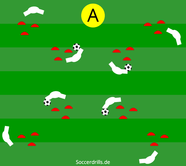 - Der Spieler läuft um die Markierungen herum und erwartet dort, in geschlossener Stellung, den Ball.