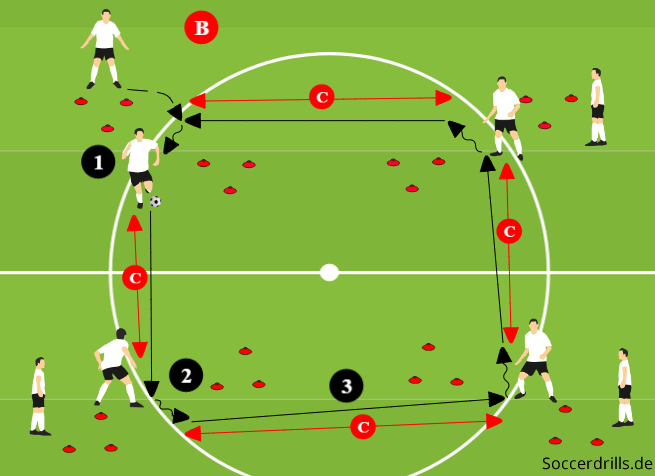 - Wie A, jetzt ziehen beide Spieler den Ball um die Markierungen und passen zurück.