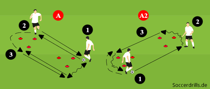 - Er lässt auf den Startspieler klatschen, der den Ball um die Markierungen zieht, um wieder mit zwei Kontakten die Aktion neu zu startet.
