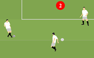Wir spielen 2 gegen 1 auf ein offenes Tor. Nach Ballverlust wird der Verteidiger getauscht.