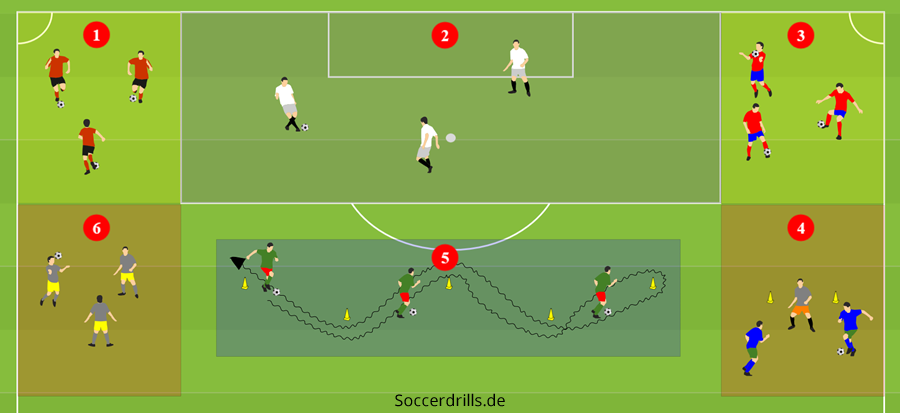 Diese Trainingsübung ist ein Multitalent unter den Aufwärmübungen. Finten, Körpertäuschungen, Ballgefühl, Passspiel, Überzahlspiel und Dribbling, wir bieten bereits viele Lerninhalte beim Warm Up an. Problemlos lassen sich die Trainingsinhalte in den einzelnen Stationen deinen Bedürfnissen anpassen. Bei bestimmten Stationen besteht die Möglichkeit von Wettkämpfen, siehe „Variationen“.