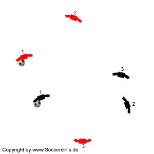 Bilde viele Dreiergruppen, jede Gruppe erhält einen Ball. Die Spieler in jeder Gruppe werden von 1 bis 3 durchnummeriert. 1 passt zu 2, 2 passt zu 3 und 3 wieder zu 1 usw.