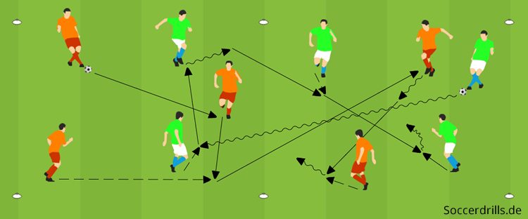 Wir trainieren mit einigen koordinativen und kleineren taktischen Elementen im Ablauf. Wurde oben vom Scannen geschrieben, bedeutet dies genauer: Die Spielsituation erfassen, den freien Raum suchen und den Deckungsschatten verlassen. Koordinativ verlangen wir die gute Ballverarbeitung, das Passspiel, kurze und schnelle Richtungsänderungen und eventuell kleine Dribblings.