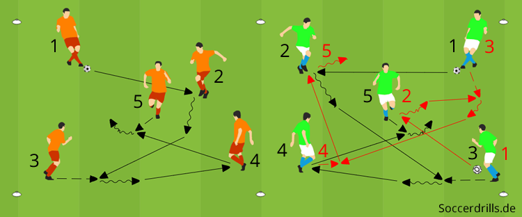 - Anders als in der Grafik (linke Seite), dort sind die Varianten dargestellt, passen sich die Spieler den Ball zunächst ohne Positionswechsel in der festen Reihenfolge zu. 1 passt zu 2, 2 zu 3, 3 zu 4, 4 zu 5 und 5 zu 1 und es beginnt wieder von vorn.