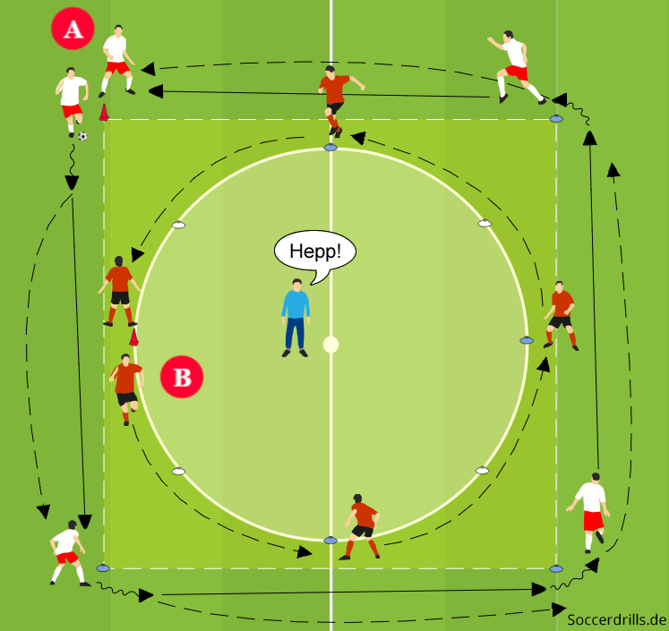 - In der Grafik erkennst du am Kreis und dem Quadrat jeweils ein rotes Hütchen, dies markiert den Startpunkt für Team A am Quadrat und Team B am Kreis.