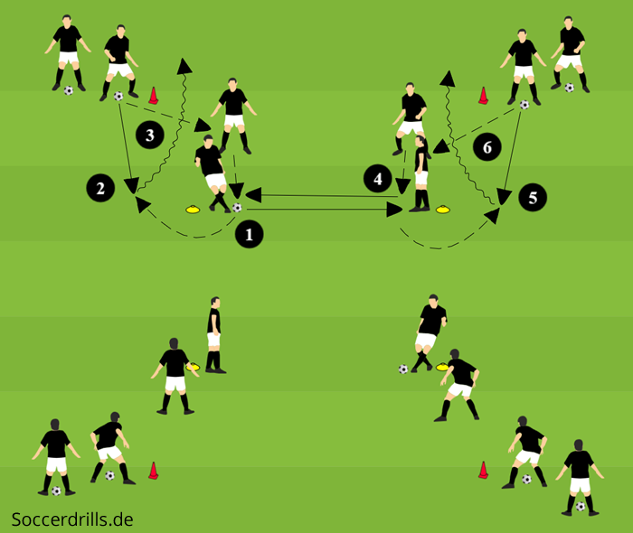 In dieser Übung verbinden wir das Kurzpassspiel und eine Dribbel- mit verschiedenen Laufstrecken. Es ist nie Pause und das Einhalten der Laufwege und genaues Passspiel sind Voraussetzung für einen störungsfreien Ablauf.