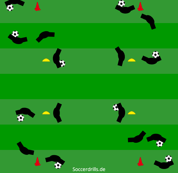 - Die Spieler dribbeln diagonal in die Gruppe auf der anderen Übungsseite.