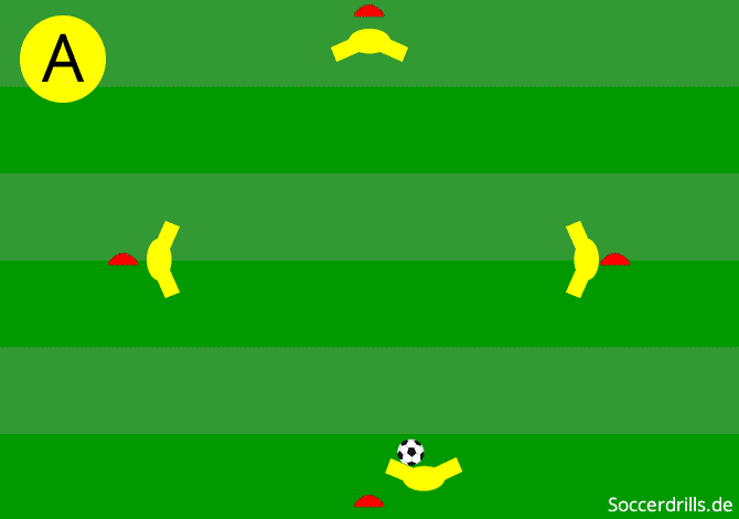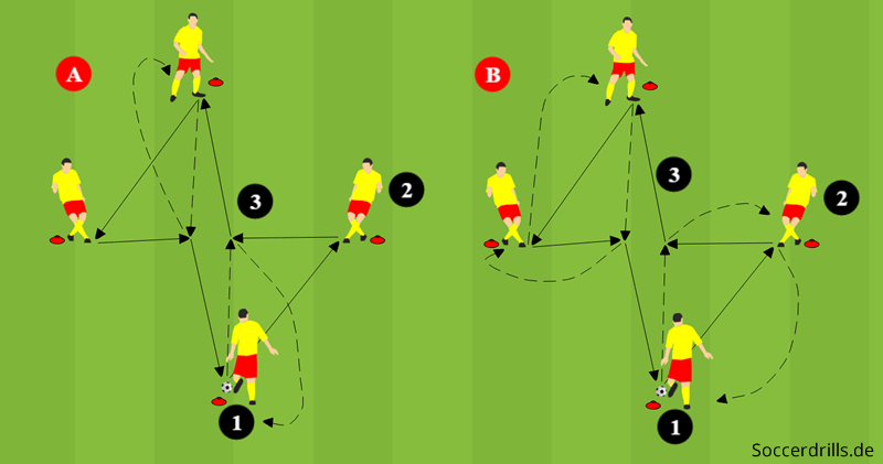 - Noch schwerer: Die Startspieler übernehmen nach dem Pass auf die andere Seite nicht die Positionen des Mitspielers, der zuerst angespielt wurde, sondern die Position des anderen Mitspielers. Passt der Spieler beim Start nach rechts, läuft er aus der Mitte nach links.