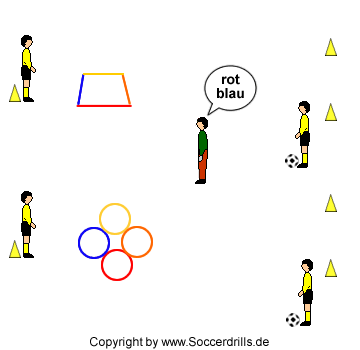Sollten nicht vier verschiedene Farben vorhanden sein, haben die Spieler die Wahl, welche Stange oder welchen Reifen einer aufgerufenen Farbe sie überspringen oder betreten. Haben die Spieler ihre Aufgabe erfüllt, laufen sie in Richtung Kleintor, wo sie einen Pass von einem Mitspieler erhalten. Der Ball wird kurz kontrolliert und ins Kleintor gepasst. Torschütze und Anspieler tauschen anschließend die Gruppen.