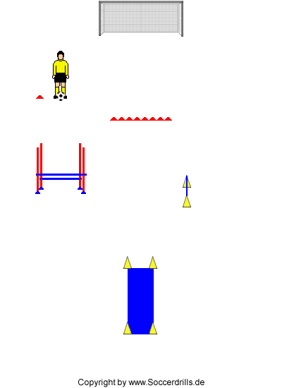 Sollten keine Hürden vorhanden sein, baue ein Hindernis mit Hütchen. Der Ball muss dann seitlich am Hindernis vorbeigepasst werden. Am Ende des Parcours wird der Ball in ein leeres Tor geschossen.