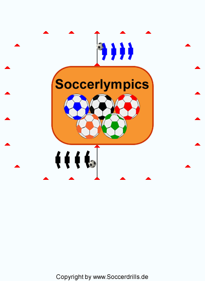 Es gibt viele Möglichkeiten, die Bahn aufzubauen. Lege mit Bodenmarkierungen einen Innen- und einen Außenkreis, oder nutze den Mittelkreis auf dem Fußballfeld. Halte die Bahn möglichst kurz, wir wollen Spaß haben und uns nicht quälen. Anschließend: Siegerehrung und Pressekonferenz.