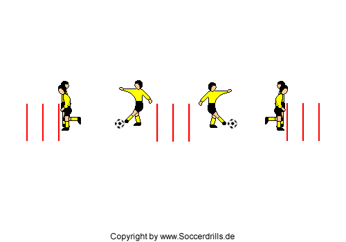 Sie starten auch diese Übung mit Ball, passen auf den anspielbereiten Teamkollegen und wechseln dann durch den Stangenparcours auf die andere Seite. Dort erhalten sie einen Pass, der sofort zurückgespielt wird. So geht es immer weiter. Die Anspieler der beiden anderen Stangenfelder bewegen sich nach dem Passspiel ebenfalls immer durch den Stangenwald auf die andere Seite.