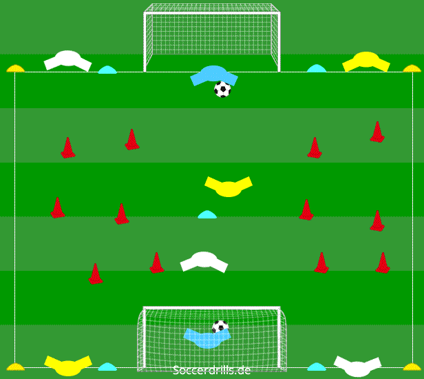 - Er sucht sich ein Hütchentor seiner Wahl und durchdribbelt dieses, anschließend passt er zum Torwart, der den Ball sofort zum Spieler der nächsten Gruppe passt. Falls keine nächste Gruppe vorhanden ist, erfolgt der Rückpass zum Passgeber. Anschließend beginnt der Ablauf erneut.