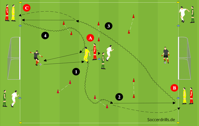 - Er sucht sich ein Hütchentor seiner Wahl und durchdribbelt dieses, anschließend passt er zum Mitspieler auf Position C, dieser startet sein Dribbling nach vorne.
