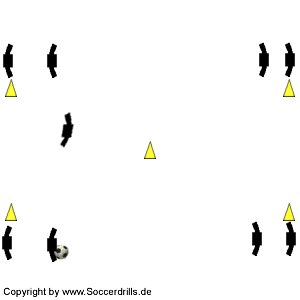Auf den langen Seiten des Rechtecks erfolgt der Pass in die nächste Ecke auf der rechten Seite. Nach dem Pass startet der Spieler auf die zentrale Position und erhält dort den Rückpass. Diesen Pass leitet er sofort in die nächste Ecke (gegen den Uhrzeigersinn) weiter, um sich dann der Gruppe anzuschließen, aus der er den Pass erhalten hat. Der Spieler, der den Pass in die zentrale Position ausgeführt hat, läuft in die nächste Gruppe am Rechteck. Der Ablauf wird auf der anderen Seite des Rechtecks wiederholt.