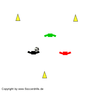 Das macht Spaß! Drei Spieler treten im Zweikampftraining gegeneinander an. Der Ballbesitzer versucht irgendeins der 3 Hütchen umzuschießen. Bei Erfolg gibt es einen Punkt, er muss allerdings das Hütchen wieder aufstellen, während die Übung weiterläuft. Deshalb sollte diese Übung, nach kurzer Einlaufzeit, immer als Wettkampf durchgeführt werden. Schnell soll es gehen, ohne Pausen. Stoppe die Übung rechtzeitig, um eine Überbealstung zu vermeiden.