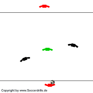 Die Ballbesitzer veruchen nun, einen der beiden Angreifer anzuspielen. Die Angreifer bieten sich durch ständige Bewegung an. Nach erfolgtem Pass und sicherer Ballkontrolle, wird der Ball vom Angreifer zu seinem Mitspieler weitergeleitet. Dieser passt anschließend zurück auf den Anspieler außerhalb des Übungsfeldes. Nach 3 – 4 Minuten Positionen wechseln.