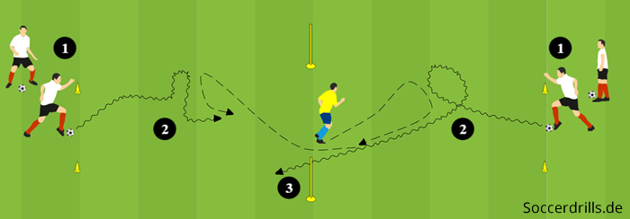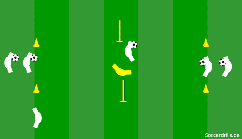 - Im Stangentor wird ein Abwehrspieler postiert, rechts und links an den Hütchen Spieler mit Bällen.